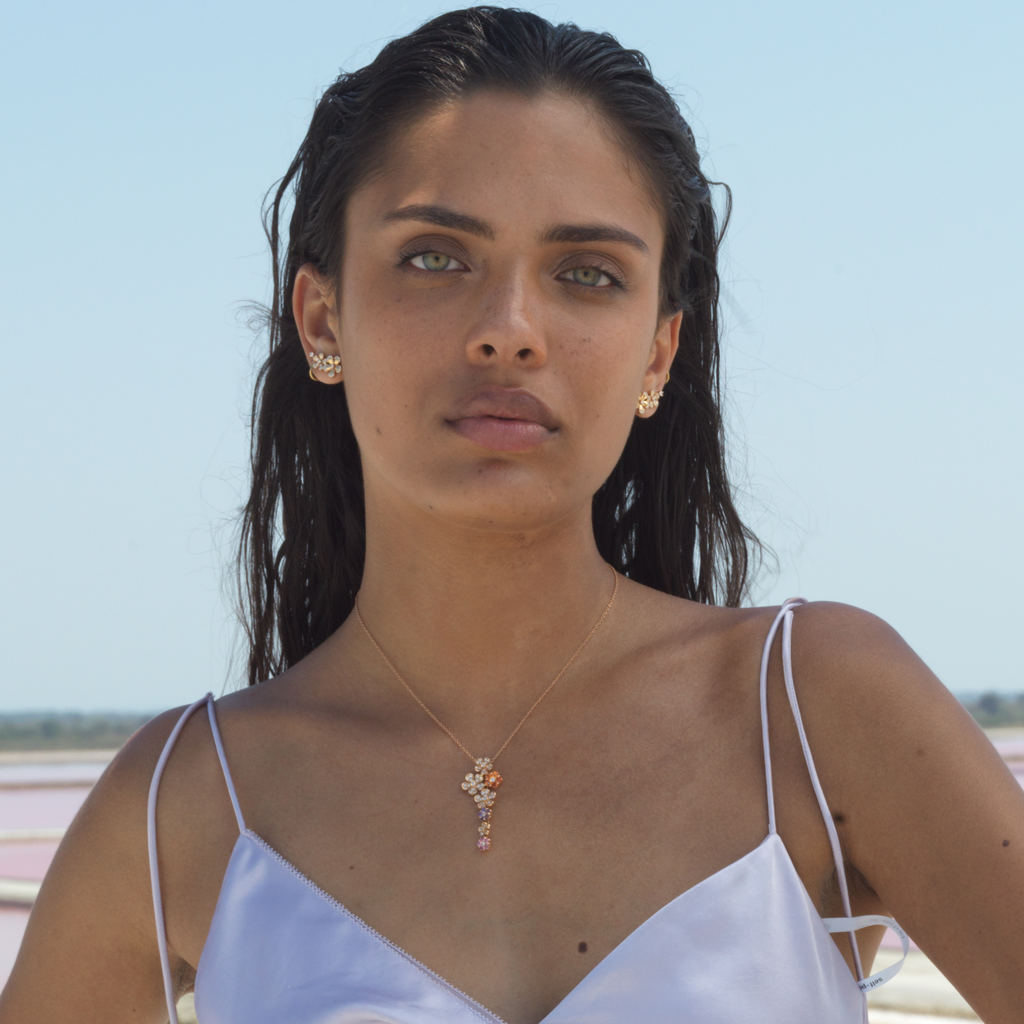 Le Collier Primavera cascade en or rose, diamants et saphirs de couleurs est également disponible en or blanc et en or jaune.